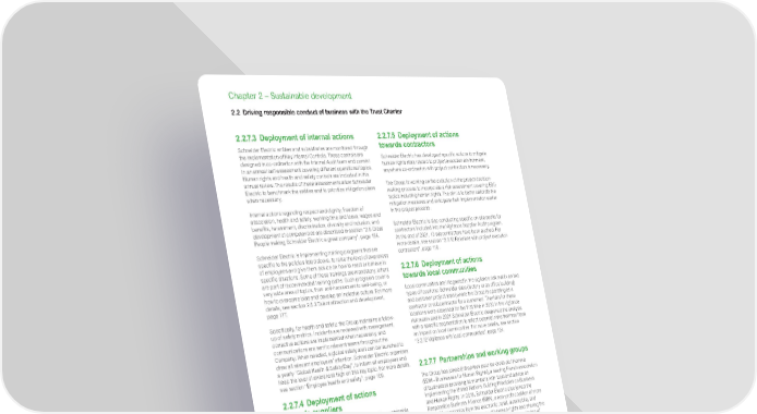 www.se.com Schneider Electric Universal Registration Document 2021 108 Chapter 2 – Sustainable development 2.2 Driving responsible conduct of business with the Trust Charter 2.2.7.3 Deployment of internal actions Schneider Electric entities and subsidiaries are monitored through the implementation of Key Internal Controls. These controls are designed in co-ordination with the Internal Audit team and consist in an annual self-assessment covering different operational topics. Human rights and health and safety controls are included in this annual review. The results of these assessments allow Schneider Electric to benchmark the entities and to prioritize mitigation plans when necessary. Internal actions regarding respect and dignity, freedom of association, health and safety, working time and leave, wages and benefits, harassment, discrimination, diversity and inclusion, and development of competencies are described in section “2.5 Great People making Schneider Electric a great company”, page 164. Schneider Electric is implementing training programs that are specific to the policies listed above, to raise the level of awareness of employees and give them advice on how to react or behave in specific situations. Some of these trainings are mandatory, others are part of recommended training paths. Such programs cover a very wide area of topics, from anti-harassment to well-being, or how to overcome bias and develop an inclusive culture. For more details, see section 2.5.3 Talent attraction and development, p a g e 17 7. Specifically, for health and safety, the Group maintains a follow- up of safety metrics. Incidents are reviewed with management, corrective actions are implemented when necessary, and communications are sent to relevant teams throughout the Company. When needed, a global safety alert can be launched to draw all relevant employees’ attention. Schneider Electric organizes a yearly “Global Health & Safety Day”, to inform all employees and keep the level of awareness high on this key topic. For more details, see section “Employee health and safety”, page 109. 2.2.7.4 Deployment of actions towards suppliers Human rights are included in the integration of the sustainable purchases approach in the selection of new suppliers. Schneider Electric uses a qualification process called Schneider Supplier Quality Management (SSQM) to select new suppliers. It is based on an evaluation questionnaire combined with on-site audits, which include human rights and health and safety assessments. Schneider Electric’s Supplier Code of Conduct states the framework in which the Group wishes to operate with vendors. Schneider Electric expects suppliers to respect the fundamental principles on health, safety, people’s protection, and development as defined in this document. Strategic suppliers are also assessed through Ecovadis 3 rd party, leveraging ISO26000 norm, where Labor and Human rights is one of the four pillars of the methodology. Other actions are implemented through the Group’s vigilance plan. For more details, see section “2.2.9 Vigilance plan”, page 112, and section “2.2.11 Sustainable relations with suppliers”, page 117. 2.2.7.5 Deployment of actions towards contractors Schneider Electric has developed specific actions to mitigate human rights risks related to project execution environment, anywhere co-ordination with project contractors is necessary. The Group is working on the evolution of the project decision- making process to incorporate a risk assessment covering ESG topics including human rights. The aim is to better calibrate the mitigation measures and anticipate their implementation earlier in the project process. Schneider Electric is also conducting specific on-site audits for contractors included into the Vigilance Supplier Audit program. At the end of 2021, 13 subcontractors have been audited. For more details, see section “2.2.10 Relations with project execution contractors”, page 116. 2.2.7.6 Deployment of actions towards local communities Local communities are integrated in the vigilance risk matrix on two types of locations: Schneider sites (factory or an office building) and customer project sites (where the Group is operating as a contractor or subcontractor for a customer). The risks for these locations were assessed for the first time in 2020 in the vigilance risk matrix and in 2021 Schneider Electric deepened the analysis with a specific segmentation to select potential risks that may have an impact on local communities. For more details, see section “2.2.12 Vigilance with local communities”, page 124. 2.2.7.7 Partnerships and working groups The Group has joined Entreprises pour les droits de l’Homme (EDH – Businesses for Human Rights), a leading French association of businesses providing its members with tools and advice on implementing the United Nations Guiding Principles on Business and Human Rights. In 2018, Schneider Electric also joined the Responsible Business Alliance (RBA), a non-profit coalition of more than 120 companies from the electronic, retail, automobile, and leisure industries, for compliance with human rights and sharing the best practices with regards to on-site auditing and monitoring of suppliers’ activity, including forced-labor issues. The Group also joined the Global Compact LEAD working group “Decent Work in Global Supply Chain”. Schneider Electric co-leads the G7 Business for Inclusive Growth (B4IG) coalition’s “Advancing human rights in direct operations and supply chains” and “Building inclusive workplaces” working groups. As a result of the working group on advancing human rights, in 2020, B4IG members adopted a collective statement supporting a European framework on mandatory human rights due diligence and providing suggestions to be considered in legislation. In 2021, the working group has implemented a toolbox gathering best practices from companies’ members and put specific a