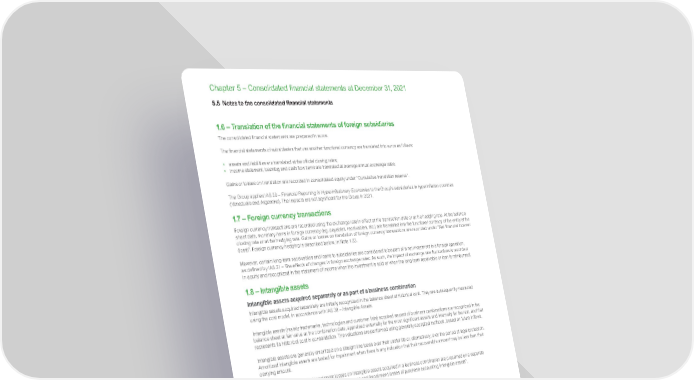 www.se.com 354 Schneider Electric Universal Registration Document 2021 Chapter 5 – Consolidated financial statements at December 31, 2021 1.6 – Translation of the financial statements of foreign subsidiaries The consolidated financial statements are prepared in euros. The financial statements of subsidiaries that use another functional currency are translated into euros as follows: • assets and liabilities are translated at the official closing rates; • income statement, backlog and cash flow items are translated at average annual exchange rates. Gains or losses on translation are recorded in consolidated equity under “Cumulative translation reserve”. The Group applies IAS 29 – Financial Reporting in Hyperinflationary Economies to the Group’s subsidiaries in hyperinflation countries (Venezuela and Argentina). The impacts are not significant for the Group in 2021. 1.7 – Foreign currency transactions Foreign currency transactions are recorded using the exchange rate in effect at the transaction date or at the hedging rate. At the balance sheet date, monetary items in foreign currency (eg. payables, receivables, etc.) are translated into the functional currency of the entity at the closing rate or at the hedging rate. Gains or losses on translation of foreign currency transactions are recorded under “Net financial income/ (loss)”. Foreign currency hedging is described below, in Note 1.23. However, certain long-term receivables and loans to subsidiaries are considered to be part of a net investment in a foreign operation, as defined by IAS 21 – The effects of changes in foreign exchange rates . As such, the impact of exchange rate fluctuations is recorded in equity and recognized in the statement of income when the investment is sold or when the long-term receivable or loan is reimbursed. 1.8 – Intangible assets Intangible assets acquired separately or as part of a business combination Intangible assets acquired separately are initially recognized in the balance sheet at historical cost. They are subsequently measured using the cost model, in accordance with IAS 38 – Intangible Assets . Intangible assets (mainly trademarks, technologies and customer lists) acquired as part of business combinations are recognized in the balance sheet at fair value at the combination date, appraised externally for the most significant assets and internally for the rest, and that represents its historical cost in consolidation. The valuations are performed using generally accepted methods, based on future inflows. Intangible assets are generally amortized on a straight-line basis over their useful life or, alternatively, over the period of legal protection. Amortized intangible assets are tested for impairment when there is any indication that their recoverable amount may be less than their carrying amount. Amortization expenses and impairment losses on intangible assets acquired in a business combination are presented on a separate statement of income line item, “Amortization expenses and impairment losses of purchase accounting intangible assets”. Trademarks The trademarks fair value is determined using the royalty method at the date of acquisition. Trademarks acquired as part of a business combination are not amortized when they are considered to have an indefinite life. The criteria used to determine whether or not such trademarks have indefinite lives and, as the case may be, their lifespan, are as follows: • brand awareness; • outlook for the brand in light of the Group’s strategy for integrating the trademark into its existing portfolio. Non-amortized trademarks are tested for impairment at least annually and whenever there is an indication they may be impaired. When necessary, an impairment loss is recorded. Internally-generated intangible assets Research and development costs Research costs are expensed in the statement of income when incurred. Development costs for new projects are capitalized if, and only if: • the project is clearly identified and the related costs are separately identified and reliably monitored; • the project’s technical feasibility has been demonstrated and the Group has the intention and financial resources to complete the project and to use or sell the resulting products; • the Group has allocated the necessary technical, financial and other resources to complete the development; • it is probable that the future economic benefits attributable to the project will flow to the Group. 5.5 Notes to the consolidated financial statements