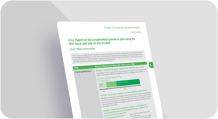 313 Life Is On | Schneider Electric www.se.com Chapter 4 – Corporate Governance Report Corporate Governance 4. 4.2.2 Report on the compensation granted or paid during the 2021 fiscal year (say on pay ex-post ) 4.2.2.1 Pillars and principles The principles and criteria determining the 2021 compensation described in this section were supported by the shareholders at the Annual Shareholders’ Meeting on April 28, 2021. They are deemed to constitute the last policy approved by the shareholders in the meaning of Article L. 22-10-8 of the French Commercial Code and govern the entirety of the compensation granted by the Group to the Corporate Officers until the next policy is approved by the shareholders. Pillar How It is reflected in the Group 2021 Compensation Policy Pay-for-performance Principle 1: Prevalence of variable components: circa 80% for CEO (at target). A prevalent part of the Corporate Officer target package shall be variable; the 2021 target package thus consists of approximately 80% variable pay component (excluding pension payments). Chairman and Chief executive officer: On target pay mix Fixed 18% Annual incentive 23% Performance shares 59% 18% 82% Principle 2: Performance evaluated via economic and measurable criteria. Performance is evaluated via criteria that are mainly economic (80% of variable cash compensation and 75% of multi-year Performance Shares) and measurable, which are selected based on KPIs used in the market communication and drivers of the Group’s strategy. All criteria have measurable targets approved by the Board at the beginning of the performance period, ensuring targets are achievable but demanding. Principle 3: Financial and Sustainability objectives are fairly balanced and distributed between short-term (annual incentive) and medium-term (long-term incentive) components. 2021 Annual Incentive (80% financial/ 20% sustainability): • 40% Group organic sales growth • 30% Adjusted EBITA margin (organic) improvement • 10% Group cash conversion rate • 20% Schneider Sustainability Impact (SSI) 2021 Long-term incentive (75% financial/ 25% susutainability): • 40% Adjusted Earning per Share (EPS) • 35% Relative Total Shareholder Return • 25% Schneider Sustainability External & Relative Index (SSERI) Alignment with shareholders’ interests Principle 4: Significant proportion of the total compensation delivered in shares. The Corporate Officer’s target package consists of approximately 60% long-term share-based compensation, meaning their compensation is subject to the same share price volatility that shareholders experience. Principle 5: Performance conditions aligned to shareholders’ expectations and Schneider Electric’s strategic priorities. Performance criteria were selected from financial indicators that are most representative of Group performance and that are closely linked to shareholder value creation. Performance levels required to reach targets were set at the beginning of the performance period in line with the objectives disclosed to the market at the same time as the results of the previous fiscal year and were supplemented by factors that enable the Group to offer a long-term and satisfactory development outlook for all stakeholders in the Company’s success.