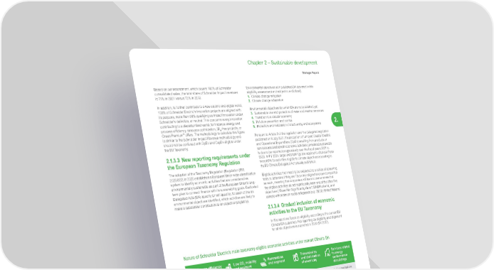 69 Life Is On | Schneider Electric www.se.com Chapter 2 – Sustainable development Strategic Report 2. Based on our assessment, which covers 100% of Schneider consolidated sales, the total share of Schneider Impact revenues is 71% in 2021 versus 70% in 2019. In addition, to further contribute to a new electric and digital world, 100% of Schneider Electric’s innovation projects are aligned with its purpose, more than 90% qualifying as impact innovation under Schneider’s definition, or neutral. This concerns every innovation contributing to a decarbonized world, for instance energy and process efficiency, resource optimization, SF 6 -free projects, or Green Premium ™ offers. The methodology to calculate this figure is similar to the Schneider Impact Revenue methodology and should not be confused with OpEx and CapEx eligible under the EU Taxonomy. 2.1.3.3 New reporting requirements under the European Taxonomy Regulation The adoption of the Taxonomy Regulation (Regulation (EU) 2020/852) in 2020 establishes a European Union-wide classification system to identify economic activities that are considered as environmentally sustainable as part of the European Union’s long- term plan to connect finance with its sustainability goals. Dedicated Delegated Acts (DA) specify (or will specify), for each of the six environmental objectives identified, which activities are likely to make a substantial contribution to an objective (eligibility). Environmental objectives with published DA (covered in this eligibility assessment and subject to evolutions): 1. Climate change mitigation 2. Climate change adaptation Environmental objectives for which DA are not published yet: 3. Sustainable use and protection of water and marine resources 4. Transition to a circular economy 5. Pollution prevention and control 6. Protection and restoration of biodiversity and ecosystems Pursuant to Article 8 of the regulation and the delegated regulation published on 6 July 2021, the proportion of turnover, Capital (CapEx) and Operational Expenditure (OpEx) resulting from products or services associated with economic activities considered sustainable is due to be reported progressively over the fiscal years 2021 to 2023. In FY 2021, large undertakings are required to disclose those three KPIs for activities eligible to climate objectives according to the EU Climate Delegated Act already published. Eligible activities then need to be subjected to a series of screening tests, to determine if they are Taxonomy-aligned and can be reported as such, meaning that corporates will have to demonstrate that the eligible activities do not significantly harm any of the other five objectives (“Does Not Significantly Harm”, DNSH criteria), and comply with minimum social safeguards (e.g. OECD, United Nations). 2.1.3.4 Gradual inclusion of economic activities to the EU Taxonomy In this report we focus on eligibility according to the current EU Climate DA published. Full reporting on eligibility and alignment for all six objectives is expected in 2024 (FY 2023). Nature of Schneider Electric’s main taxonomy-eligible economic activities under current Climate DA Energy efficiency in buildings Low CO 2 mobility end segment Renewables end segment Transmission and distribution of electricity Services related to energy performance of buildings Energy efficient building automation and control systems Smart monitoring and regulation of heating systems Zoned thermostats and devices for the smart monitoring of electricity loads or heat loads Electric vehicles charging stations and supporting grid reinforcement technologies Electrical infrastructure for urban and suburban public transport Port infrastructure for shore-side electrical power to vessels at berth and electrification and efficiency of ports’ operations Manufacture of renewable energy technologies, equipping wind and solar power generation capacities Equipment and projects for the construction of transmission and distribution infrastructure Communication and control technologies for the controllability and observability of the electricity system, such as advanced automation software Technical consultations such as energy audits, simulations and trainings Energy management services Energy performance contracts Proportion of Taxonomy-eligible economic activities in the Group’s total turnover, capital (CapEx) and operational expenditure (OpEx) 28% of turnover | 27% of CapEx | 23% OpEx Read more on Schneider Electric business model and strategy page 20 Read more on Schneider Sustainability Impact page 63 Read more on Schneider Electric saved and avoided methodology page 134 Read more on Green Premium page 156