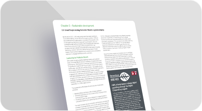 www.se.com Schneider Electric Universal Registration Document 2021 180 Chapter 2 – Sustainable development 2.5 Great People making Schneider Electric a great company By the end of 2021, 3,700 sales employees have been certified in Consultative Selling, almost 40% of the target population. 2022 will see continued strong deployment. As a result of the program, 93% of managers say they have observed the participants using the consultative approach consistently while engaging with customers. Given the success and impact of the program in 2021, the program has been adapted and extended to other teams including tendering, customer care and customer facing roles in Global Supply Chain to ensure adoption end to end of a more consultative approach to engage and interact with customers. Leadership for Profitable Growth: With a fast-changing, rapidly digitizing industry and customer base, Schneider Electric faces a challenge of transformation and performance. The Executive Committee committed to the market to significantly increase both top and bottom line and set a goal to rapidly align, educate, and mobilize the top 1,000 leaders across the company to drive for this outcome. As the COVID-19 pandemic hit the world, severely disrupting supply chains, customer engagements, business continuity and sales, through the design and rapid deployment of the “Leadership for Profitable Growth” program, Schneider was able to both continue to drive its business profitably in extraordinary circumstances, whilst delivering critical business, strategic, and financial acumen learning to its executive leadership in a 100% digital solution. The Leadership for Profitable Growth executive masterclass combines: • Markets & Financial theory with a finance professor • Schneider applications in the context of the company’s three core business models • A business game simulation designed to engage leaders in competitive learning for optimizing share price performance The result has been above competitor performance, a substantial increase in business literacy, and a more commercially capable executive leadership population prepared to deliver in the most challenging market circumstances. The program has also been recognized by the industry at the 2021 Brandon Hall Group HCM Excellence Awards with the Leadership for Profitable Growth masterclass winning Gold in the ‘Best Unique or Innovative Learning and Development Program’ category and two Silver awards. Building on the 83% Learner Promoter Score, in 2021, the program has been progressively cascaded to other leadership levels in the Group. Almost 1,500 leaders in total have now completed the program. Foundational digital skills for all employees: Digital is a must to succeed in this VUCA (volatile, uncertain, complex, ambiguous) world and our employees are key to support the business transformation. The Group has set the goal to achieve >90% employees undergo digital upskilling through the Digital Citizenship program and digital transformation training by 2025 (SSE #22). This commitment to growing the digital mindset and digital skills of all employees, enabling them to become “digital citizens” was introduced in the Digital Citizenship framework in 2018. This provided an understanding of the digital baseline of all employees. A smart learning solution “Boost Your Digital Knowledge” was launched in 2020, by the Digital Academy, designed for employees to self-assess and evaluate strength and development areas, followed by learning suggestions to upskill in key digital areas based on individual results. In 2021, 20,100+ employees completed the Boost Your Digital Knowledge assessment. Specifically for Global Supply Chain, a Digital Acumen Quiz has been designed according to the digital citizen competency requirement. This quiz recommends related e-learning if results are below a certain threshold. This quiz also helps to objectively measures an employee’s digital citizenship level within the function. For workers, the SSE #22 goal is to achieve >90% completion of two hours of training per year on digital transformation. Supporting these programs and available any time, the Digital Citizenship Learning Corner empowers employees to own their development as digital citizens by exploring and completing courses as needed by topic, persona, and/or function. In total, the Group had 171,800+ completions by over 29,700 employees on digital foundational knowledge. A special attention is given to the blue collars in the plants and distribution centers by implementing physical learning corners in each site with individual access to the learning platform with dedicated, multi-language content. >90% of employees undergo digital upskilling through the Digital Citizenship program In Europe Operations, a data science upskilling program was piloted in 2021. Data science skills are critical to the digital transformation. In 2021, 60 employees from across different functions, including marketing, sales, and IT, were identified for the eight-month program. They were provided with specialized learning experiences to accelerate their development including functional skills and technical skills provided on the Pluralsight platform. Participants also had the opportunity to practice their skills during a mini- hackathon. The program will result in employees being skilled to take a Data Analyst or Data Engineer role in future. Generations SSE #22 90% 41% Baseline 2025 target 2021 Progress 0 100 74%