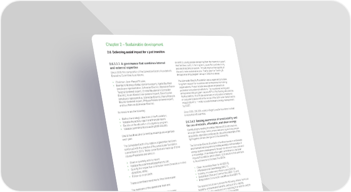 www.se.com Schneider Electric Universal Registration Document 2021 196 Chapter 2 – Sustainable development 2.6 Delivering social impact for a just transition 2.6.3.3.3 A governance that combines internal and external expertise Since 2019, the composition of the Schneider Electric Foundation’s Executive Committee is as follows: • Chairman: Jean-Pascal Tricoire; • Members: Monique Barbut (external expert), Agnès Bouffard (employee representative, Schneider Electric), Bénédicte Faivre- Tavignot (external expert), Christel Heydemann (Schneider Electric), Yoann Kassi-Vivier (external expert), David Lechat (employee representative, Schneider Electric), Pierre-François Mourier (external expert), Philippe Pelletier (external expert), and Luc Rémont (Schneider Electric). Its missions are the following: • Define the strategic directions of the Foundation; • Validate the activity report and financial report; • Decide on the allocation of budgets by program; • Validate commitments exceeding EUR 200,000. One to two Executive Committee meetings are organized each year. The Schneider Electric Foundation organization has been reinforced with the creation of the zone/cluster foundation committees in 2019. These committees are made up of zone /cluster Presidents and aims to: • Share a quarterly activity report; • Validate the commitments/partners to join; • Specify the respective contribution levels (financial or in-kind donations, skills); • Follow up on projects. These committees meet two to three times a year. The members of the operational team are: • Gilles Vermot Desroches, General Delegate; • Patricia Benchenna, Corporate Philanthropy Director; • Brigitte Antoine, Employee Engagement Leader; • Morgane Lasserre, Administrative Assistant. Lastly, the Foundation’s Selection Committee is composed of: • Gilles Vermot Desroches, General Delegate; • Patricia Benchenna, Corporate Philanthropy Director; • François Milioni, Program Director, Training & Entrepreneurship. 2.6.3.4 Give all young people the means to build solutions for a better life The Schneider Electric Foundation supports innovative initiatives all over the world that enable the most vulnerable, especially young people, to access the energy needed to succeed and build the world of tomorrow. To be relevant and effective, i.e., to have the greatest possible impact and respond specifically to the needs of the people concerned, it is essential that these initiatives combine education, technological innovation, social innovation, and entrepreneurship. These initiatives cover three main areas. 2.6.3.4.1 Vocational training for the youth, underprivileged persons, and entrepreneurship support Training is the historical mission of the Schneider Electric Foundation. The energy sector, and more particularly electricity and renewable energies, offers a lot of potential, especially in areas where access to energy is difficult and growing. Passing on skills to young people and giving them the means to support their families could, in the long term, boost the local electricity and electrotechnical sectors. This will improve their quality of life and create sustainable jobs. That is what the Training & Entrepreneurship program set up in 2009 is all about. The Schneider Electric Foundation encourages and provides long-term support for vocational and entrepreneurial training organizations. These include associations and electrical profession educational institutions. The vocational training and entrepreneurship program capture 67% of the funding allocated by the Foundation. All of these actions are monitored and measured on a quarterly basis within the scope of the Schneider Sustainability Impact (SSI #11): “1 million people trained in energy management by 2025”. Since 2009, 328,359 underprivileged people have been trained in more than 45 countries. 2.6.3.4.2 Raising awareness of sustainability and the use of reliable, affordable, and clean energy Contributing to meeting the United Nations SDGs also involves, amongst other things, raising awareness among as many people as possible, especially young people, about the challenges of the fight against climate change and of sustainability. The Schneider Electric Foundation therefore invests in emblematic and international programs by making available its knowledge of energy systems management, through donations in resources and/ or knowledge. It has made a four-year commitment to the Solar Impulse Foundation, which selects 1,000 solutions that contribute to the achievement of at least five SDGs: • Clean, Accessible Water for All (SDG 6); • Affordable and Clean Energy (SDG 7); • Industry, Innovation and Infrastructure (SDG 9); • Sustainable Cities and Communities (SDG 11); and • Responsible Consumption and Production (SDG 12). The selected solutions must meet the following criteria: technical feasibility, environmental benefits, and economic viability. Schneider Electric employees are mobilizing their skills to analyze the various solutions within their field of expertise. The Solar Sound System project by Atelier 21, a Foundation partner, obtained two Solar Impulse Efficient labels: • Solar sound systems for events powered by renewable energies (solar or bike-powered). With seven systems in place in France and Switzerland, Solar Sound System has set up solidarity projects in Haiti, Brazil, India, Taiwan, and Cameroon and has projects in Reunion, the United States, and South Africa. • Regenbox, the first do-it-yourself “non-rechargeable” alkaline battery charger. Regenbox aims to be ecological and anti- planned obsolescence. This project is also an educational tool and a mean to raising awareness about a different use of batteries in order to reduce the amount of electronic waste so present in our daily lives. Bertrand Piccard, Chairman of the Solar Impulse Foundation, will then promote this portfolio of solutions to corporate and political leaders 