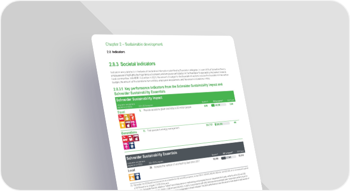 www.se.com Schneider Electric Universal Registration Document 2021 240 Chapter 2 – Sustainable development 2.8.3 Societal indicators Indicators are published on the basis of declarative information submitted by Foundation delegates. It covers 80% of Schneider Electric employees and highlights the importance of company and employee participation in the Foundation’s approach to involvement towards local communities. With EUR 19.5 million in 2021, the amount of budget for the Foundation’s actions includes the Foundation’s intervention budget, the amount of the donations from entities, employees and partners, and the amount of donations in kind. 2.8.3.1 Key performance indicators from the Schneider Sustainability Impact and Schneider Sustainability Essentials Schneider Sustainability Impact Long-term commitments aligned to UN SDGs 2021-2025 programs Baseline (1) 2021 progress (2) 2025 Target Equal 9. Provide access to green electricity to 50 million people 30M 0 100 +4.2M 50M Generations 11. Train people in energy management 281,737 0 100 328,359 1M Schneider Sustainability Essentials Long-term commitments aligned to UN SDGs 2021-2025 programs Baseline (1) 2021 progress (2) 2025 Target Local 25. Increase the number of volunteering days since 2017 18,469 27,981 50,000 (1) Generally, the 2020 performance serves as a baseline for SSI and SSE programs, except SSI #1, SSI #10, SSE #5, SSE #14, and SSE #20, which are measured against a 2019 baseline to mitigate COVID-19 impacts. (2) Each year, Schneider Electric obtains a “limited” level of assurance on methodology and progress from an independent third party verifier for all the SSI and SSE indicators (except SSI #6, SSI #7, SSI #+1, SSE #12 and SSE #23, in 2021), in accordance with ISAE 3000 assurance standard (see Independent verifier’s report on page 224). Please refer to page 206 for the methodological presentation of each indicator. The 2021 performance is also discussed in more details in each section of this report. 2.8.3.2 Breakdown of the Foundation’s financial commitments Indicator Units 2021 2020 2019 Foundation's intervention budget € 4,000,000 4,000,000 4,000,000 Breakdown by program Training and entrepreneurship % 75% 63% 51% Energy poverty % 3% 7% 28% Raising awareness about sustainable development % 17% 10% 17% Employees’ volunteering/skills-based sponsorship % 1% 1% 4% Emergency % 4% 19% UP Breakdown by region Africa & Middle East % 8% 25% 31% America % 10% 4% 6% Asia & Pacific % 48% 45% 11% Europe % 18% 20% 44% Cross countries % 16% 6% 8% 2.8 Indicators