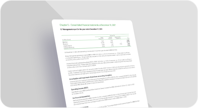www.se.com 406 Schneider Electric Universal Registration Document 2021 Chapter 5 – Consolidated financial statements at December 31, 2021 (in millions of euros) Full Year 2020 Energy Management Industrial Automation Central functions & digital costs Total Backlog 7, 2 31 1,765 – 8,996 Revenue 19,344 5,815 – 25 ,15 9 Adjusted EBITA 3,634 992 (700) 3,926 Adjusted EBITA (%) 18.8% 17.1% 15.6% On December 31, 2020, the total backlog to be executed in more than a year amounted to EUR 639 million. Energy Management generated an adjusted EBITA of EUR 4,501 million, i.e. 20.3% of its revenues, up c. 140 bps organic (up 150 bps on a reported basis and up c. 170 bps organically compared to 2019), mainly driven by the increase in volume, a good level of industrial productivity, and a positive impact from mix. Industrial Automation generated an adjusted EBITA of EUR 1,242 million, i.e. 18.5% of its revenues, up c. 90 bps organic (up 140 bps on a reported basis and up c. 60 bps organically compared to 2019), due mainly to the increase in volume and positive net pricing, despite a dilutive effect on mix from the lesser growth of AVEVA. Central functions & digital costs in 2021 amounted to EUR 756 million (EUR 700 million in 2020), reducing slightly as a proportion of revenue to 2.6%. Investment in the Group’s strategic priorities increased year-over-year, while the Corporate cost element continued to be an area of focus and remained under tight control, decreasing to around 0.7% of Group revenues in 2021. Amortization and impairment of purchase accounting intangibles The amortization and impairment of purchase accounting intangibles amounted to EUR 410 million compared with EUR 207 million last year. The increase is mostly driven by additional amortization linked with acquisitions completed in the second semester 2020 and the first semester 2021 (mainly RIB Software SE, Larsen & Toubro and OSIsoft LLC). Operating income (EBIT) Operating income or EBIT (Earnings Before Interest and Taxes), increased from EUR 3,088 million for 2020 to 4,331 million for 2021, an increase of 40.3%. Net financial income/loss Net financial loss amounted to EUR 176 million for 2021, compared to EUR 278 million for 2020. Financial result has been improved significantly, thanks to the decrease of the cost of net financial debt (from EUR 112 million in 2020 to EUR 95 million in 2021), as well as a reduced impact from forex exchange fluctuations (from EUR 36 million in 2020 to EUR 8 million in 2021). Income tax expense The effective tax rate was 23.2% for 2021, and 22.7% for 2020. The corresponding income tax expense increased from EUR 638 million for 2020 to EUR 966 million for 2021. Share of profit/ (loss) of associates The share of associates was a EUR 84 million profit for 2021, compared to EUR 66 million profit for 2020. Non-controlling interests Non-controlling interests in net income for 2021 totaled EUR 69 million, compared to EUR 112 million for 2020. This represents the share in net income attributable to the non-controlling interests, mainly coming from the Group Chinese subsidiaries and AVEVA subgroup. Profit for the year (attributable to owners of the parent) Profit for the year attributable to the equity holders of our parent company amounted to EUR 3,204 million for 2021, compared to EUR 2,126 million profit for 2020. Earnings per share Basic Earnings per share amounted to EUR 5.76 per share for 2021 and EUR 3.84 per share for 2020. 5.7 Management report for the year ended December 31, 2021