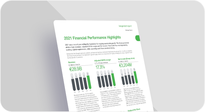 9 Life Is On | Schneider Electric www.se.com Integrated report Strategic Report 28.9 25.2 27.2 25.7 24.7 2017 2018 2019 2020 2021 2,799 3,673 3,476 2,102 2,253 2017 2018 2019 2020 2021 17.3 15.6 15.6 15.1 14.8 2017 2018 2019 2020 2021 6.13 4.72 5.32 4.64 3.85 2017 2018 2019 2020 2021 3,204 2,126 2,413 2,334 2,150 2017 2018 2019 2020 2021 2.90 2.60 2.55 2.35 2.20 2017 2018 2019 2020 2021 2021 Financial Performance Highlights 2021 was a record year setting the foundation for ongoing sustainable growth. The Group generated all-time high revenues, adjusted EBITA margin and Net Income. Free Cash Flow was impacted by working capital requirements, while operating cash flows remained strong. Demand for the Group’s products, systems, software and services remained at high levels throughout 2021. As with all companies, the Group faced pressure from tightness in global supply chains, but responded with agility, leveraging its unique, digitized model for the benefit of customers. Revenue In billions of euros €28.9B Free Cash Flow In millions of euros €2,799M Adjusted EBITA margin In % of Group revenues 17. 3 % Adjusted Earnings Per Share In euros € 6 .13 Net Income (Group share) In millions of euros €3,204M Dividend Per Share In euros €2.90 Revenues were up +12.7% organic (+14.9% reported) with strong growth from both businesses and across all four regions. There was strong demand across the Group’s four end-markets, as revenues rebounded to above 2019 levels on an organic basis. FX impacts were negative -1.3% due to the strengthening of the EUR against the USD. There was positive scope impact of +3.5% from recent acquisitions. The Group generated EUR 2.8 billion of Free Cash Flow, reflective of the strong operating cash result of EUR 4.5 billion. Working capital evolution was negative EUR 853 million, reflective of the strong external demand environment. Net capital expenditure of EUR 817 million remained stable as a percentage of sales at around 3%. Adjusted EBITA reached EUR 5.0 billion, a margin of 17.3%, expanding organically by +140 basis points. The margin expansion was driven through a combination of pricing actions to compensate for inflationary costs, industrial productivity, and execution on the Group’s operational efficiency plan. Both businesses contributed to the margin expansion. Adjusted Earnings Per Share was EUR 6.13, up 30% on last year, mostly driven by the strong operating performance. The weighted average number of shares in issue remained broadly stable compared to last year. Net Income (Group share) reached EUR 3.2 billion, up +51% on last year. Restructuring costs were -EUR 225 million, down EUR 196 million on last year. Other Operating Income and Expenses were -EUR 21 million, mainly consisting of some disposal gains offset by M&A and integration costs. Net financial expenses reduced by EUR 102 million, while the Group’s effective tax rate was 23.2%, in line with expectations. The proposed dividend is EUR 2.90 per share, up 12% on last year, subject to approval at the Annual Shareholder’s Meeting to be held on May 5, 2022. The proposed dividend would be paid on May 19, 2022, and represents a continuation for the twelfth year of the Group’s progressive dividend policy.