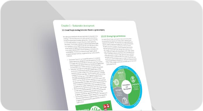 www.se.com Schneider Electric Universal Registration Document 2021 178 Chapter 2 – Sustainable development 2.5 Great People making Schneider Electric a great company Providing opportunities for the next generation is a key part of the strategy to harness the power of a multi-generational workforce, having five generations working side by side. As part of SSI #10, our five-year ambition is to grow the early-career pipeline by two times. This involves leveraging traditional approaches today but migrating to more digital, borderless, and self-paced offers, ensuring the Company can de-bias practices and create a more equal playing field for those interested in Schneider and sustainability. This will be achieved through flagship global programs and partnerships, supplemented by country-specific initiatives: • Schneider Global Virtual Student Experience: A completely digital experience designed to provide students with a way to engage with Schneider Electric through e-learning modules and on project simulations that mirror the skills and qualities that are important to our mission and when serving customers. • Schneider Go Green: an annual global competition for business and Science Technology Engineering Mathematics (STEM) students around the world to find innovative solutions for energy management and automation. Over the past ten years, Schneider Go Green has had over 117,400 registrants and more than 21,700 students have submitted ideas from 172 countries. In 2021 alone, more than 25,400 students registered with close to 2,800 students submitted their ideas, proving that Go Green continues to be consistent in developing strong and increasing interest from students for this contest, especially from emerging economies. • Development programs around the world that are structured to help support the acceleration of early career talent through a robust training and development path including graduate programs, internships, apprenticeships, and co-ops. • Sponsorship initiatives, virtual Careers Fairs, office/site tours, Innovation Summit tours, digital and face-to-face speaking engagements and networking opportunities, mentoring relationships. 2x number of opportunities for interns, apprentices, and fresh graduate hires Schneider Global Virtual Student Experience In 2021, the Company ran a digital and borderless learning experience, providing opportunities to the next generation of talent broken into three phases: skills building through professional e-learning courses, project simulation using genuine business problems, and feedback and coaching from Schneider Electric employees. This resulted in 1.6 million impressions and 5k+ registrations, growing the next generation pipeline of talent in key skill areas: digital, sustainability, services, supply chain, and electronics/R&D. Generations SSI #10 x2.00 4,939 Baseline 2025 target 2021 Progress x1.25 2.5.3.5 Driving high performance Schneider Electric’s approach to performance and development is anchored by the Group’s Core Values, and for leaders, by the Leadership Expectations. The approach encourages learning and growth, enabling employees to reach their full potential individually, as teams, and as a Company. The Group’s robust process of setting individual performance and development goals annually with regular reviews during the year provides everyone with a clear roadmap to deliver with impact based on the “what” and the “how” to ultimately achieve collective success. Schneider Electric employees are encouraged to seek, give, and receive feedback, empowering them to take ownership for driving their individual performance, and managers are encouraged to support them with coaching and frequent conversations, driving the business forward. In 2021, 98% of eligible employees completed a performance and development review. Performance and Development Set clear expectations to drive high performance Summarize achievements and learnings Regular review of progress and feedback GOALS REVIEW CHECK-IN A c t L i k e O w n e r s L e a r n E v e r y D a y E m b r a c e D i f f e r e n t D a r e t o D i s r u p t C u s t o m e r F i r s t 2.5.3.6 Enabling sustainable careers Developing employees in their current role and for future roles is critical to enable growth of the Group’s businesses. In line with the belief that all employees are talent, Schneider Electric believes that all employees should take ownership of their own unique career development, whatever the stage of their career, supported by their managers and enabled by digital tools. To empower and engage employees with this approach, Schneider Electric held its first Career Week for all employees in 2021. Over 250 events took place with employees participating from over 90 countries, sharing career stories, having career check-in conversations with their manager, learning about different roles and skills, and being equipped with tools and resources to develop, grow, and shape their future. 95% of employees surveyed were positive about the event, especially appreciating the time to discuss and learn about career development.