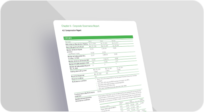www.se.com Schneider Electric Universal Registration Document 2021 338 Chapter 4 – Corporate Governance Report LT I P 2 018 Plan number Plan 30 Plan 31 Plan 31 bis Date of Annual Shareholders’ Meeting Apr. 25, 2016 Apr. 25, 2016 Apr. 25, 2016 Date of the grant by the Board Mar. 26, 2018 Mar. 26, 2018 Oct. 24, 2018 Number of shares at grant of which: 25,800 2,318,140 28,000 – Jean-Pascal Tricoire 18,000 42,000 Number of rights outstanding as of Dec. 31, 2020 23,417 2,086,639 28,000 Number of shares delivered in 2021 22,992 2,0 4 3 , 374 24,687 Number of rights canceled in 2021 425 43,265 3,313 Number of rights outstanding as of Dec. 31, 2021 0 0 0 Vesting date/vesting period Mar. 26, 2021 3 years Mar. 26, 2021 3 years Oct. 24, 2021 3 years End of holding period Mar. 25, 2022 N/A N/A Presence condition Yes Performance conditions • Yes for 70% of the shares/100% for the Corporate Officers and Executive Committee members • 2018, 2019, 2020 adjusted EBITA average achievement rate (40%) • 2018, 2019, 2020 cash conversion rate average (25%) • TSR ranking at end of 2020 (15%) • 2018, 2019, 2020 Planet & Society barometer index (20%) % achievement of the Performance conditions 9 8 .18 % Detailed achievement of the Performance conditions At its meeting of February 10, 2021, the Board of Directors assessed the achievement rate of performance criteria for Plans n° 30, 31 and 31bis granted in 2018 based on the Group’s performance over the three-year period 2018- 2020 and set the final rate of achievement at 98.18%, i.e. a reduction of 1.82% in relation to the number of shares originally granted. Performance conditions Reference period Weight (%) Actual achievement Pay-out rate Weighted pay-out rate Group organic adjusted EBITA achievement rate 2018 13.3% +0.5 pts 100% 32.00% 2019 13.3% +0.7 pts 100% 2020 13.3% +0.2 pts 40% Group cash conversion average rate 2018-2020 25% 123.3% 15 0%* 37. 5 0 %* Relative TSR 2018-2020 15% 1 st rank 15 0%* 2 2.5 0%* Planet & Society barometer/ Schneider Sustainability Impact 2018 6.6% 6 .10 100% 18.18% 2019 6.6% 7.7 7 9 3 .10 % 2020 6.6% 9.32 79.60% Total 100% 9 8 .18% * The good level of cash conversion exceeded the initial ambition and the over-performance of the relative TSR performance condition off-set the under-performance of the adjusted EBITA condition (for 8%). LT I P 2 019 Plan number Plan 32 Plan 33 Plan 34 Plan 35 Date of Annual Shareholders’ Meeting Apr. 25, 2016 Apr. 25, 2016 N/A N/A Date of the grant by the Board Mar. 26, 2019 Mar. 26, 2019 Jul. 24, 2019 Oct. 23, 2019 Number of shares at grant of which: 25,800 2,313,650 87,110 17,450 – Jean-Pascal Tricoire 18,000 42,000 Number of rights outstanding as of Dec. 31, 2020 20,817 2,18 5 , 42 2 84,080 17,450 Number of shares delivered in 2021 0 1,800 0 0 Number of rights canceled in 2021 0 9 4 ,170 3,370 0 4.2 Compensation Report