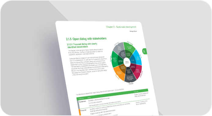 75 Life Is On | Schneider Electric www.se.com Chapter 2 – Sustainable development Strategic Report 2. 2.1.5 Open dialog with stakeholders 2.1.5.1 Focused dialog with clearly identified stakeholders This diagram is an overview of sector stakeholders proposed in France by Gimélec, the French trade association for electrical equipment, automation, and related services. Schneider Electric engages in open and continuous dialog with each of its stakeholders. In particular, the Sustainability department takes into account the comments, ratings, and evaluations from stakeholders on the Group’s Sustainability Policy and programs. This feedback is integrated into the drawing up of the registration document, the Group corporate brochure (Schneider Sustainability Report), the integrated report, and new improvement plans throughout the Company program, as well as during the design of the SSI every three years. Buildings, Industry, Infrastructure and Energy Non-Governmental Organizations, Media, etc. Social Partners and Bodies, UIMM, etc. Legislators, European Commission ILO, OECD, etc. Other Standardization Bodies, Teaching and Research, Independent Experts, etc. SRI, Financial and Extra-Financial Analysts, etc. Groups and Professional Unions, Consortiums, JV, etc. Local Residents and Territorial Collectivities Contractors, Integrators, OEM, Systems Manufacturers, Distributors Employees Authorities and Global Compact Standardization Bodies IEC and Product Certication Shareholders, Investors, Banks and Insurers Suppliers and Subcontractors Gimélec companies C i v i l s o c i e t y S o c i a l C u s t o m e r s P a r t n e r s F i n a n c i a l I n s t i t u t i o n a l T e c h n i c a l The table below presents the major dialog channels with stakeholders. It is not exhaustive. Stakeholder Dialog Department Customers Quarterly customer satisfaction surveys Co-innovation programs Online publication of environmental information on products Quality, Customer Satisfaction, R&D, Sales, EcoDesign Financial Quarterly conference calls to present financial and extra-financial information, meetings and plenary meetings Regular meetings with individual shareholders Quarterly newsletters to shareholders Response to extra-financial rating questionnaires Individual meetings with SRI analysts Response to SRI analyst questions Finance, Secretary of the Board, Sustainability Partners Purchaser/supplier meetings Suppliers’ day Supplier qualification process Awareness-raising about the United Nations Global Compact and ISO 26000 Participation in commissions and work groups on the sustainability of professional groups Procurement, Environment, R&D, Businesses, Sustainability Social Yearly employee satisfaction survey Social dialog with employee representation bodies Sustainability Open lines Human Resources, Sustainability Technical Collaborative approach, creation, and participation in competitiveness cluster initiatives, R&D programs, university chairs, and professional associations Active participation in international standardization bodies PEP Ecopassport program R&D, Activities, Environment Institutional Commitment to and promotion of the United Nations Global Compact Relationships with public authorities, legislators, and the European Commission, especially in the field of energy efficiency Sustainability, Purchases, Influence Civil society Participation in working groups and local and international organizations on challenges within our industry Community programs Partnerships with local NGOs According to subject and audience, Foundation, and Access to Energy program