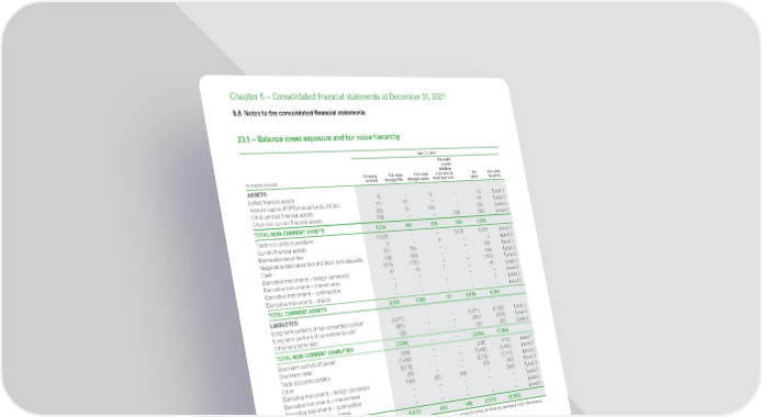 www.se.com 384 Schneider Electric Universal Registration Document 2021 Chapter 5 – Consolidated financial statements at December 31, 2021 23.1 – Balance sheet exposure and fair value hierarchy (in millions of euros) Dec. 31, 2021 Carrying amount Fair value through P&L Fair value through equity Financial assets/ liabilities measured at amortized cost Fair value Fair value hierarchy ASSETS: Listed financial assets 15 – 15 – 15 Level 1 Venture capital (FCPR)/mutual funds (SICAV) 111 111 – – 111 Level 3 Other unlisted financial assets 323 79 244 – 323 Level 3 Other non-current financial assets 585 – – 585 585 Level 2 TOTAL NON-CURRENT ASSETS 1,034 190 259 585 1,034 Trade accounts receivables 6,829 – – 6,829 6,829 Level 2 Current financial assets 4 – 4 – 4 Level 2 Marketable securities 551 551 – – 551 Level 1 Negotiable debt securities and short-term deposits 438 438 – – 438 Level 2 Cash 1,633 1,633 – – 1,633 Level 2 Derivative instruments – foreign currencies 41 40 1 – 41 Level 2 Derivative instruments – interest rates – – – – Level 2 Derivative instruments – commodities 7 – 7 – 7 Level 2 Derivative instruments – shares – – – – – Level 2 TOTAL CURRENT ASSETS 9,503 2,662 12 6,829 9,503 LIABILITIES: Long-term portions of non-convertible bonds* (6,877) – – (6,877) ( 7,12 6) Level 1 Long-term portions of convertible bonds* (651) – – (651) (636) Level 2 Other long-term debt (26) – – (26) (26) Level 2 TOTAL NON-CURRENT LIABILITIES ( 7,5 5 4) – – ( 7,5 5 4) ( 7,78 8) Short-term portion of bonds* (706) – – (706) (719) Level 1 Short-term debt (1,489) – – (1,489) (1,489) Level 2 Trade accounts payable (5,715) – – (5,715) (5,715) Level 2 Other (63) – – (63) (63) Level 2 Derivative instruments – foreign currencies (104) (55) (49) – (104) Level 2 Derivative instruments – interest rates – – – – – Level 2 Derivative instruments – commodities – – – – – Level 2 Derivative instruments – shares – – – – – Level 2 TOTAL CURRENT LIABILITIES (8,077) (55) (49) (7,973) (8,090) * The majority of financial instruments listed in the balance sheet have a fair value close to their book value, except for bonds, for which the amortized cost in the balance sheet represents EUR 8,234 million compared to EUR 8,481 million at fair value. 5.5 Notes to the consolidated financial statements