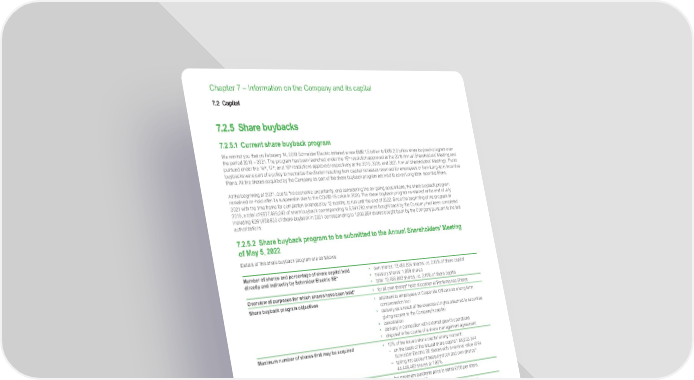 www.se.com Schneider Electric Universal Registration Document 2021 438 Chapter 7 – Information on the Company and its capital 7.2.5 Share buybacks 7.2.5.1 Current share buyback program We remind you that on February 14, 2019 Schneider Electric initiated a new EUR 1.5 billion to EUR 2.0 billion share buyback program over the period 2019 – 2021. The program has been launched under the 15 th resolution approved at the 2018 Annual Shareholders’ Meeting and pursued under the 14 th , 17 th , and 15 th resolutions approved respectively at the 2019, 2020, and 2021 Annual Shareholders’ Meetings. These buybacks were part of a policy to neutralize the dilution resulting from capital increases reserved for employees or from Long-term Incentive Plans. All the shares acquired by the Company as part of the share buyback program are held to cover Long-term Incentive Plans. At the beginning of 2021, due to the economic uncertainty, and considering the on-going acquisitions, the share buyback program remained on-hold after its suspension due to the COVID-19 crisis in 2020. The share buyback program re-started at the end of July 2021 with the time frame for completion extended by 12 months, to run until the end of 2022. Since the beginning of the program in 2019, a total of €577,499,243 of share buyback corresponding to 5,941,783 shares bought back by the Company had been completed including €261,659,633 of share buyback in 2021 corresponding to 1,809,054 shares bought back by the Company pursuant to the last authorizations. 7.2.5.2 Share buyback program to be submitted to the Annual Shareholders’ Meeting of May 5, 2022 Details of this share buyback program are as follows: Number of shares and percentage of share capital held directly and indirectly by Schneider Electric SE* • own shares: 12,455,824 shares, i.e. 2.19% of share capital • treasury shares: 1,058 shares • total: 12,456,882 shares, i.e. 2.19% of share capital Overview of purposes for which shares have been held* • for all own shares* held: allocation of Performance Shares Share buyback program objectives • allotment to employees or Corporate Officers as a long-term compensation tool • delivery as a result of the exercise of rights attached to securities giving access to the Company’s capital • cancellation • delivery in connection with external growth operations • disposal in the course of a share management agreement Maximum number of shares that may be acquired • 10% of the issued share capital at any moment: – on the basis of the issued share capital*: 56,903,344 Schneider Electric SE shares with a nominal value of €4 − taking into account treasury stock and own shares*: 44,446,462 shares or 7.80% Maximum purchase price and maximum aggregate amount of share purchases • the maximum purchase price is set at €250 per share, i.e. €14,225,836,000 Duration of the buyback program • 18 months maximum, expiring on November 4, 2023 Transactions carried out pursuant to the program authorized by the Annual Shareholders’ Meeting 2021 between April 29, 2021 and February 16, 2022 • Number of shares acquired: 1,809,954 • Average purchase price: €144.64 • Number of shares transferred: 27,287 • Average transfer price: €61.01 * As of January 31, 2022. 7.2.6 Pledge Pledges on Schneider Electric SE shares 391,184 shares are pledged. Pledges on subsidiaries’ shares Schneider Electric SE has not pledged any shares in significant subsidiaries. 7.2 Capital