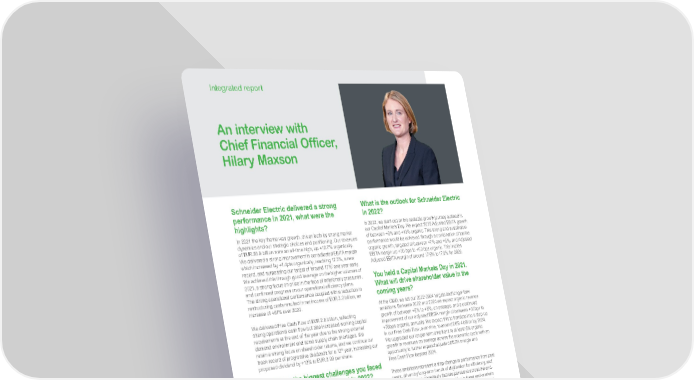 www.se.com Schneider Electric Universal Registration Document 2021 8 Integrated report Schneider Electric delivered a strong performance in 2021, what were the highlights? In 2021 the key theme was growth, driven both by strong market dynamics and our strategic choices and positioning. Our revenues of EUR 28.9 billion were an all-time high, up +12.7% organically. We delivered a strong improvement in our adjusted EBITA margin which increased by +1.4pts organically, reaching 17.3%, a new record, and surpassing our target of ‘around 17%’ one year early. We achieved this through good leverage on the higher volumes of 2021, a strong focus on price in the face of inflationary pressures, and continued progress on our operational efficiency plans. The strong operational performance coupled with a reduction in restructuring costs resulted in net income of EUR 3.2 billion, an increase of +51% over 2020. We delivered Free Cash Flow of EUR 2.8 billion, reflecting strong operational cash flow but also increased working capital requirements at the end of the year due to the strong external demand environment and some supply chain shortages. We retain a strong focus on shareholder returns, and we continue our track-record of progressive dividends for a 12 th year, increasing our proposed dividend by +12% to EUR 2.90 per share. What were the biggest challenges you faced in 2021 and what do you expect in 2022? Global supply chains came under pressure in 2021, impacting not just Schneider, but across multiple industries and geographies. While the heightened external demand is supportive of future growth, it did present some temporal challenges in customer deliveries for the year and came with associated higher costs both in freight and the sourcing of some components. Our unique global supply chain set-up helped us to navigate these challenges with agility, using lessons learned from 2020, and leveraging our multi- hub model. We also faced the ongoing challenge of a global health crisis, which limited our ability to access customer sites, impacting our Services organization. I want to take the opportunity to thank our customer facing teams, and those working in our factories and distribution centers, for all they did in putting our customers first in these challenging times. For 2022, we expect these challenges to persist, with cost inflation the new reality and pressures on global supply chains not yet over. We endeavor to meet these challenges with agility, always putting customers at the forefront of our thinking. What is the outlook for Schneider Electric in 2022? In 2022, we start-out on the scalable growth journey outlined in our Capital Markets Day. We expect 2022 Adjusted EBITA growth of between +9% and +13% organic. This strong and sustainable performance would be achieved through a combination of topline organic growth, targeted at between +7% and +9%, and Adjusted EBITA margin up +30 bps to +60 bps organic. This implies Adjusted EBITA margin of around 17.6% to 17.9% for 2022. You held a Capital Markets Day in 2021. What will drive shareholder value in the coming years? At the CMD, we set our 2022-2024 targets and longer-term ambitions. Between 2022 and 2024 we expect organic revenue growth of between +5% to +8%, on average, and a continued improvement of our adjusted EBITA margin of between +30bps to +70bps organic, annually. We expect this to translate into a step-up in our Free Cash Flow, over-time, to around EUR 4 billion by 2024. We upgraded our longer-term ambitions to at least 5% organic growth in revenues on average across the economic cycle with an opportunity to further expand adjusted EBITA margin and Free Cash Flow beyond 2024. These ambitions represent a step-change in performance from past years, driven by long-term trends of digitization for efficiency, and electrification for sustainability that are pervasive across the end- markets we serve. We expect opportunities in these end-markets to remain dynamic, and for growth to be augmented by our focus on Software, Services and Sustainability. As we move into a period of scalable and sustainable growth, our revenue profile is shifting; becoming more digital and more resilient. We expect an evolution in contribution from our Digital Flywheel, moving towards c.60% of Group revenues by 2025, from c.50% today. Within this, our strategic focus on more Software & Services is expected to drive an increase of +5pts on these elements, to c.23% of Group revenues by 2025. Software & Services also presents an opportunity for revenues to be more sticky, more resilient and with a greater proportion to be recurring in nature, increasing by +15pts to c.45% recurring by 2025. As CFO, I am excited with the opportunities that lie ahead of us, we have the portfolio, the technologies and the great people required to enable sustainable growth for years to come, as we remain committed to generating further value for all of our stakeholders. Hilary Maxson, Chief Financial Officer An interview with Chief Financial Officer, Hilary Maxson